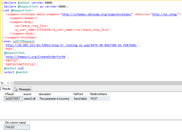 CREATE proc [dbo].[spHTTPRequest] @URI varchar(2000) = '', @methodName varchar(50) = '', @requestBody varchar(8000) = '', @SoapAction varchar(255), @UserName nvarchar(100), -- DomainUserName or UserName @Password nvarchar(100), @responseText varchar(8000) outputasSET NOCOUNT ONIF @methodName = ''BEGIN select FailPoint = 'Method Name must be set' returnENDset @responseText = 'FAILED'DECLARE @objectID intDECLARE @hResult intDECLARE @source varchar(255), @desc varchar(255)EXEC @hResult = sp_OACreate 'MSXML2.ServerXMLHTTP', @objectID OUTIF @hResult <> 0BEGIN EXEC sp_OAGetErrorInfo @objectID, @source OUT, @desc OUT SELECT hResult = convert(varbinary(4), @hResult), source = @source, description = @desc, FailPoint = 'Create failed', MedthodName = @methodName goto destroy returnEND-- open the destination URI with Specified methodEXEC @hResult = sp_OAMethod @objectID, 'open', null, @methodName, @URI, 'false', @UserName, @PasswordIF @hResult <> 0BEGIN EXEC sp_OAGetErrorInfo @objectID, @source OUT, @desc OUT SELECT hResult = convert(varbinary(4), @hResult), source = @source, description = @desc, FailPoint = 'Open failed', MedthodName = @methodName goto destroy returnEND-- set request headersEXEC @hResult = sp_OAMethod @objectID, 'setRequestHeader', null, 'Content-Type', 'text/xml;charset=UTF-8'IF @hResult <> 0BEGIN EXEC sp_OAGetErrorInfo @objectID, @source OUT, @desc OUT SELECT hResult = convert(varbinary(4), @hResult), source = @source, description = @desc, FailPoint = 'SetRequestHeader failed', MedthodName = @methodName goto destroy returnEND-- set soap actionEXEC @hResult = sp_OAMethod @objectID, 'setRequestHeader', null, 'SOAPAction', @SoapActionIF @hResult <> 0BEGIN EXEC sp_OAGetErrorInfo @objectID, @source OUT, @desc OUT SELECT hResult = convert(varbinary(4), @hResult), source = @source, description = @desc, FailPoint = 'SetRequestHeader failed', MedthodName = @methodName goto destroy returnENDdeclare @len intset @len = len(@requestBody)EXEC @hResult = sp_OAMethod @objectID, 'setRequestHeader', null, 'Content-Length', @lenIF @hResult <> 0BEGIN EXEC sp_OAGetErrorInfo @objectID, @source OUT, @desc OUT SELECT hResult = convert(varbinary(4), @hResult), source = @source, description = @desc, FailPoint = 'SetRequestHeader failed', MedthodName = @methodName goto destroy returnEND/*-- if you have headers in a table called RequestHeader you can go through them with thisDECLARE @HeaderKey varchar(500), @HeaderValue varchar(500)DECLARE RequestHeader CURSORLOCAL FAST_FORWARDFOR SELECT HeaderKey, HeaderValue FROM RequestHeaders WHERE Method = @methodNameOPEN RequestHeaderFETCH NEXT FROM RequestHeaderINTO @HeaderKey, @HeaderValueWHILE @@FETCH_STATUS = 0BEGIN --select @HeaderKey, @HeaderValue, @methodName EXEC @hResult = sp_OAMethod @objectID, 'setRequestHeader', null, @HeaderKey, @HeaderValue IF @hResult <> 0 BEGIN EXEC sp_OAGetErrorInfo @objectID, @source OUT, @desc OUT SELECT hResult = convert(varbinary(4), @hResult), source = @source, description = @desc, FailPoint = 'SetRequestHeader failed', MedthodName = @methodName goto destroy return END FETCH NEXT FROM RequestHeader INTO @HeaderKey, @HeaderValueENDCLOSE RequestHeaderDEALLOCATE RequestHeader*/-- send the requestEXEC @hResult = sp_OAMethod @objectID, 'send', null, @requestBodyIF @hResult <> 0BEGIN EXEC sp_OAGetErrorInfo @objectID, @source OUT, @desc OUT SELECT hResult = convert(varbinary(4), @hResult), source = @source, description = @desc, FailPoint = 'Send failed', MedthodName = @methodName goto destroy returnENDdeclare @statusText varchar(1000), @status varchar(1000)-- Get status textexec sp_OAGetProperty @objectID, 'StatusText', @statusText outexec sp_OAGetProperty @objectID, 'Status', @status outselect @status, @statusText, @methodName-- Get response textexec sp_OAGetProperty @objectID, 'responseText', @responseText outIF @hResult <> 0BEGIN EXEC sp_OAGetErrorInfo @objectID, @source OUT, @desc OUT SELECT hResult = convert(varbinary(4), @hResult), source = @source, description = @desc, FailPoint = 'ResponseText failed', MedthodName = @methodName goto destroy returnENDdestroy: exec sp_OADestroy @objectIDSET NOCOUNT OFFGO 1:2:3:4:5:6:7:8:9:10:11:12:13:14:15:16:17:18:19:20:21:22:23:24:25:26:27:28:29:30:31:32:33:34:35:36:37:38:39:40:41:42:43:44:45:46:47:48:49:50:51:52:53:54:55:56:57:58:59:60:61:62:63:64:65:66:67:68:69:70:71:72:73:74:75:76:77:78:79:80:81:82:83:84:85:86:87:88:89:90:91:92:93:94:95:96:97:98:99:100:101:102:103:104:105:106:107:108:109:110:111:112:113:114:115:116:117:118:119:120:121:122:123:124:125:126:127:128:129:130:131:132:133:134:135:136:137:138:139:140:141:142:143:144:145:146:147:148:149:150:151:152:153: